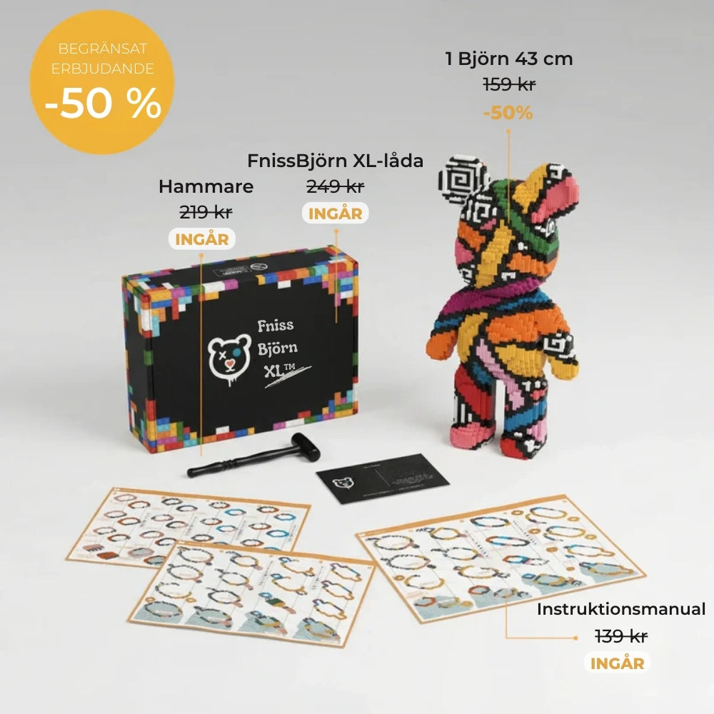 FnissBjörn XL™ är ett kreativt byggset som låter dig varva ner och fokusera på något roligt och meningsfullt. Med över 5 000 mikrobitar förvandlas byggstunden till en lugn och tillfredsställande upplevelse där varje moment leder dig närmare ett stort och dekorativt slutresultat.