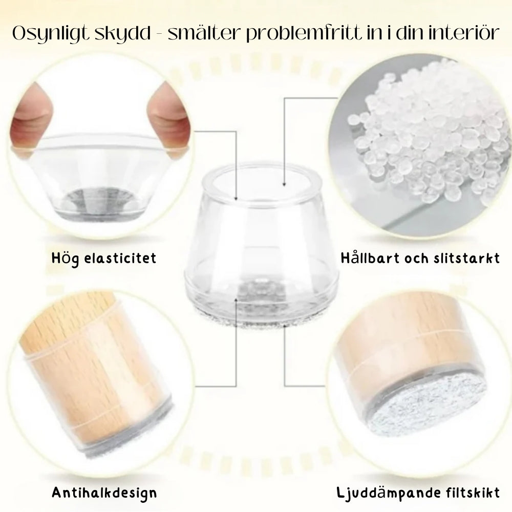 Dessa stolsockor minskar omedelbart skrapljud och skyddar golvet mot repor. Den flexibla designen ger en stabil passform på alla typer av stolben. Med en mjuk filtundersida glider stolen lätt och tyst över golvet. Produkten är enkel att installera och fungerar för både runda och fyrkantiga ben.
