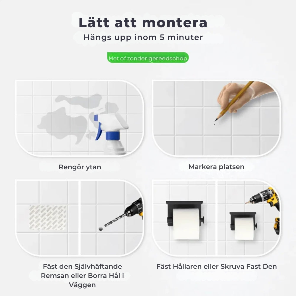 Din nya toalettrullehållare levereras med en stark 3M självhäftande remsa så att du kan montera den direkt. Ta bara bort skyddsfilmen från klistret, tryck fast hållaren ordentligt – och du är klar. Föredrar du att skruva och borra? I paketet ingår även nödvändigt monteringsmaterial, inklusive täcklock!