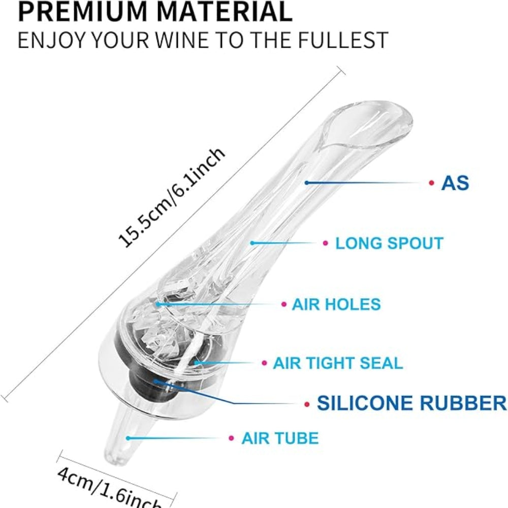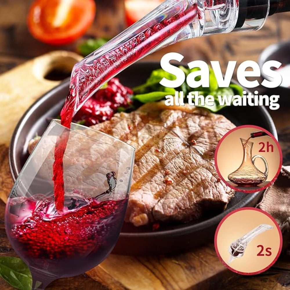 Förhöj vinupplevelsen med en vinluftare som snabbt lyfter fram doft och smak. Den professionella luftfördelaren blandar in rätt mängd syre och gör unga röda viner mjukare och mer balanserade. Det unika filterfästet reducerar sediment och orenheter för en klarare hällning. Perfekt för hemmamiddagar, vinprovningar eller som gåva till vinälskare.