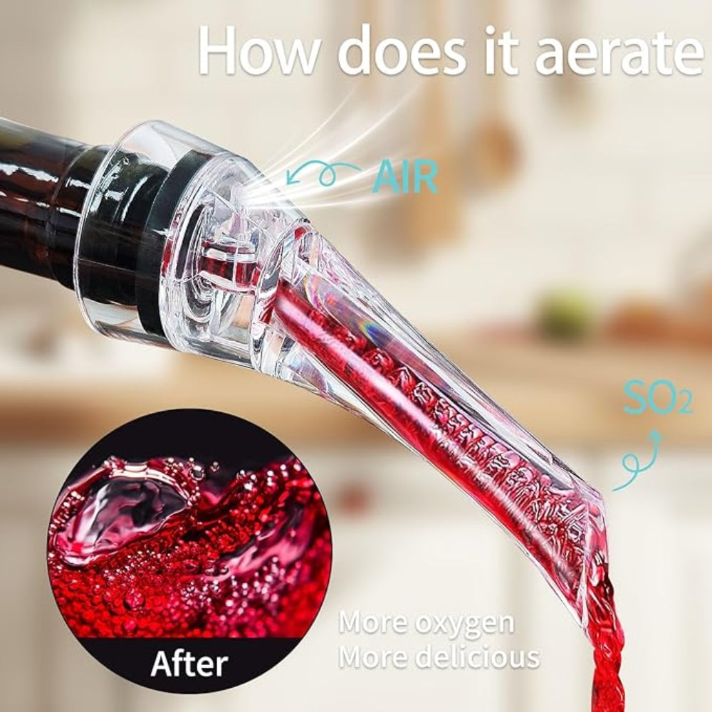 Luftportarna och den interna lufttuben blandar in syre enligt Bernoulli-effekten, vilket framhäver vinets aromer. Flödesregulatorn sprider vätskan i kammaren och ökar kontaktytan mot luften. Det inbyggda filtret bidrar till att hålla hällningen ren och fri från partiklar. Kombinationen ger en jämnare, mjukare smakupplevelse vid varje glas.